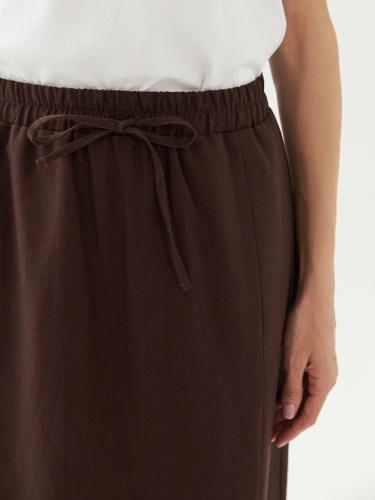 Юбка трапеция на резинке со шнурком из основной ткани для регулировки прилегания по талии. Юбка миди выполнена из льняной ткани в шоколадном цвете. По переду разрез.