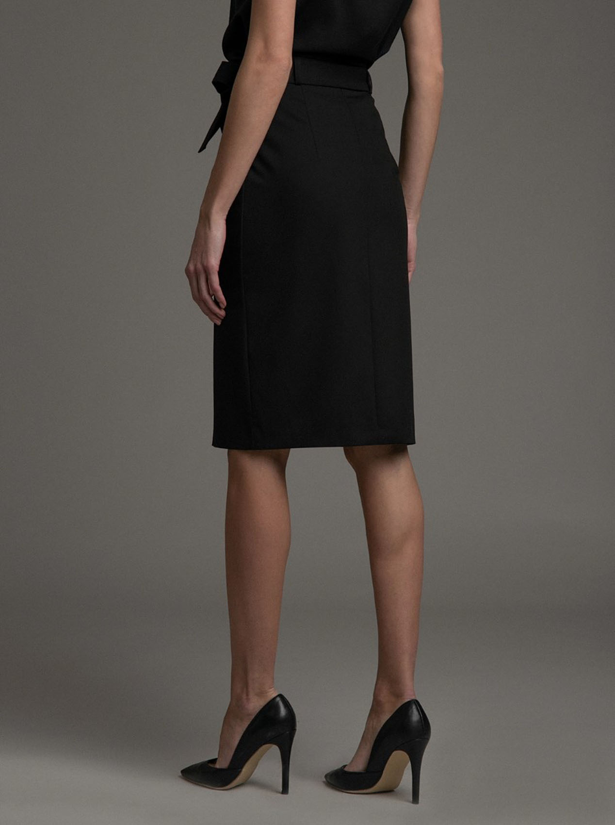 Пуговицы в тренде. Вариация на тему юбка-карандаш. Пуговицы спереди делают модель маст-хэв сезона, а пояс в форме банта создает дополнительный акцент на талии и придает женственности строгому силуэту.