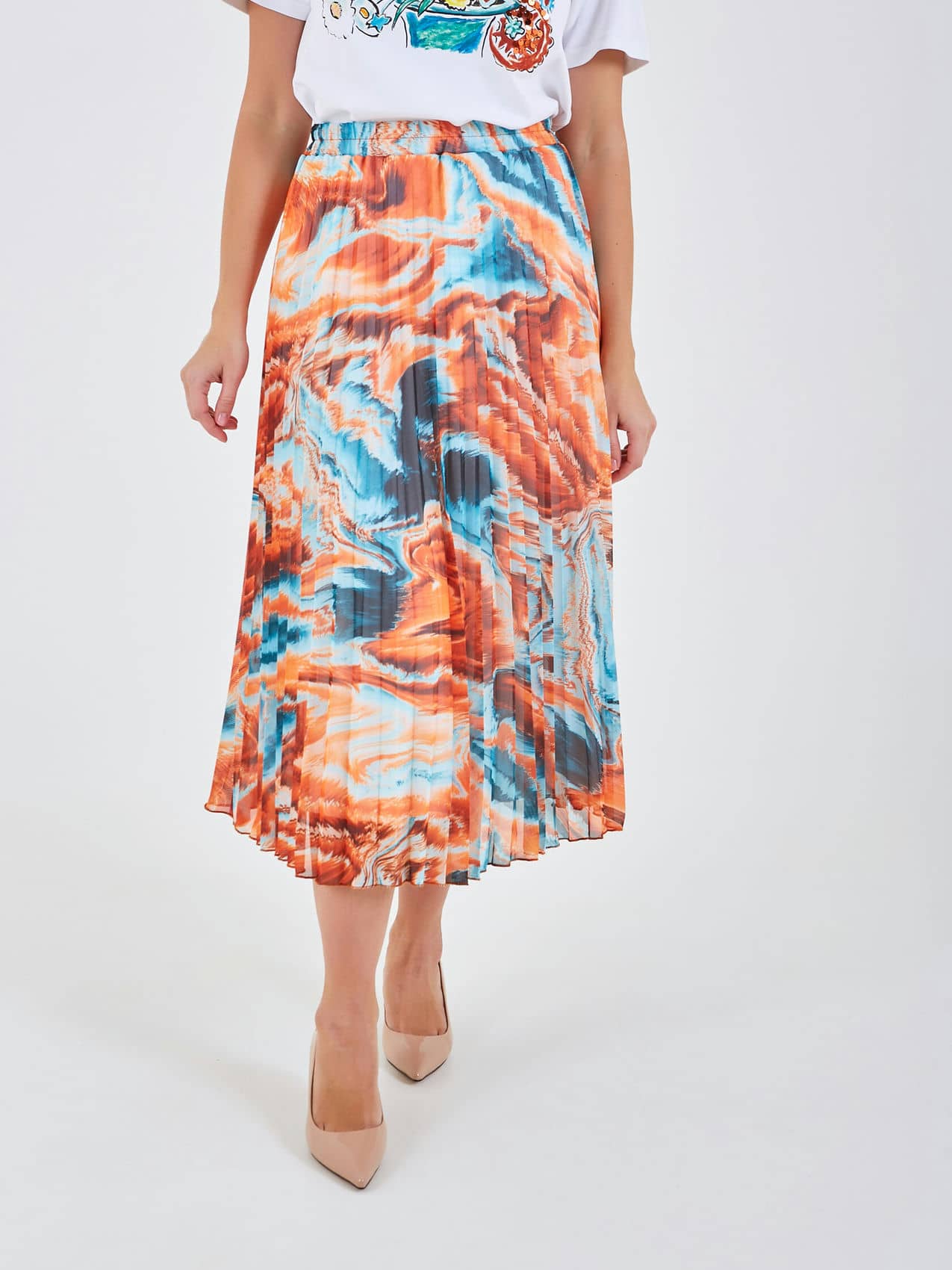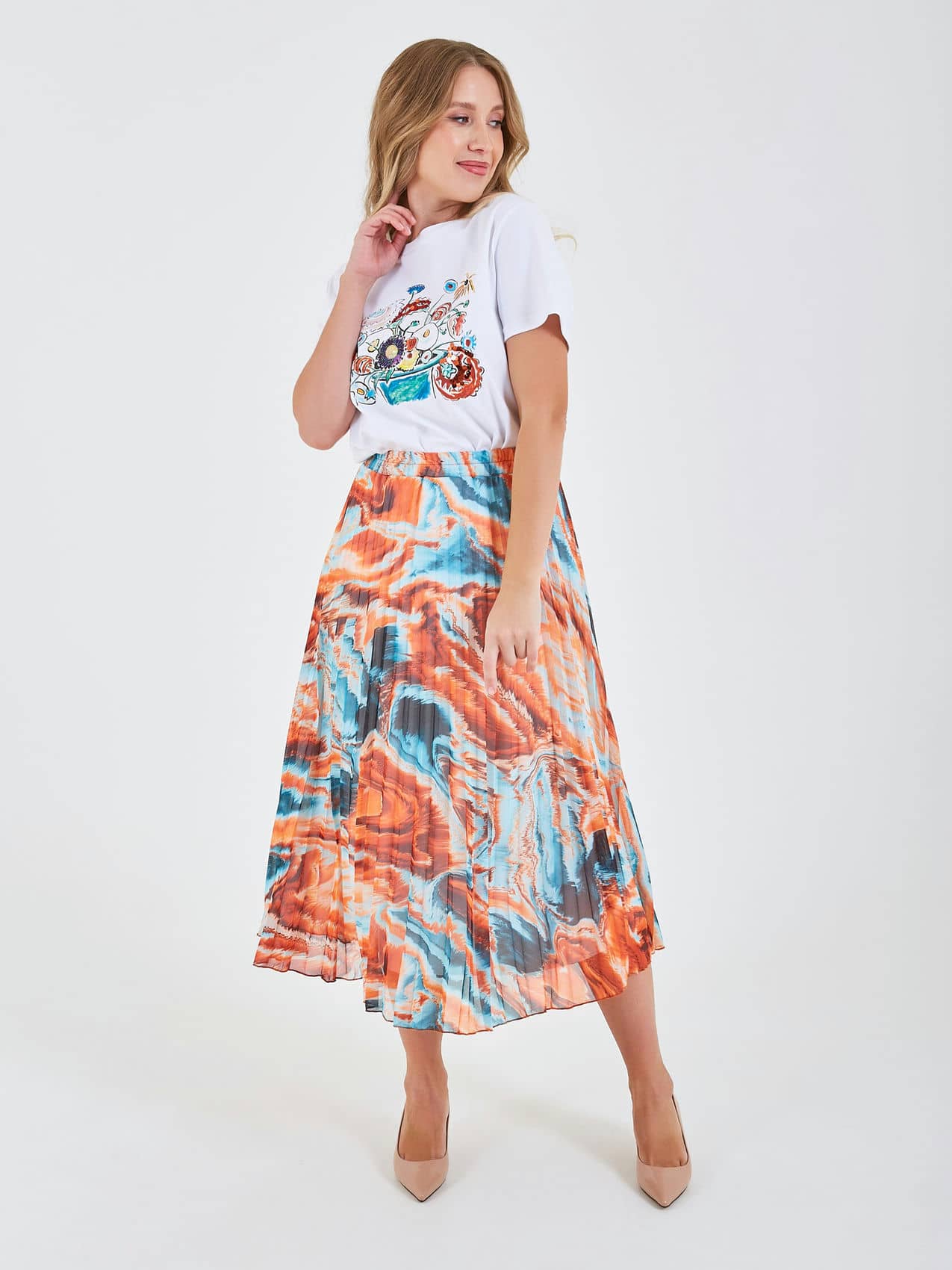 Юбка средней длины с ярким абстрактным узором в голубых и оранжевых тонах. Изготовлена из легкого, плиссированного материала, что обеспечивает удобство и хорошую посадку. Коллекция Весна-Лето 2025. Капсула "Санторини".Параметры модели: 89-70-92, рост 167, размер 44-46