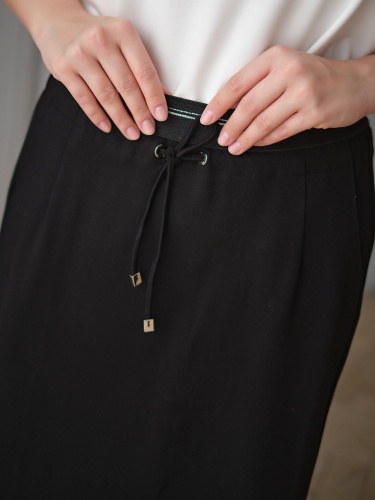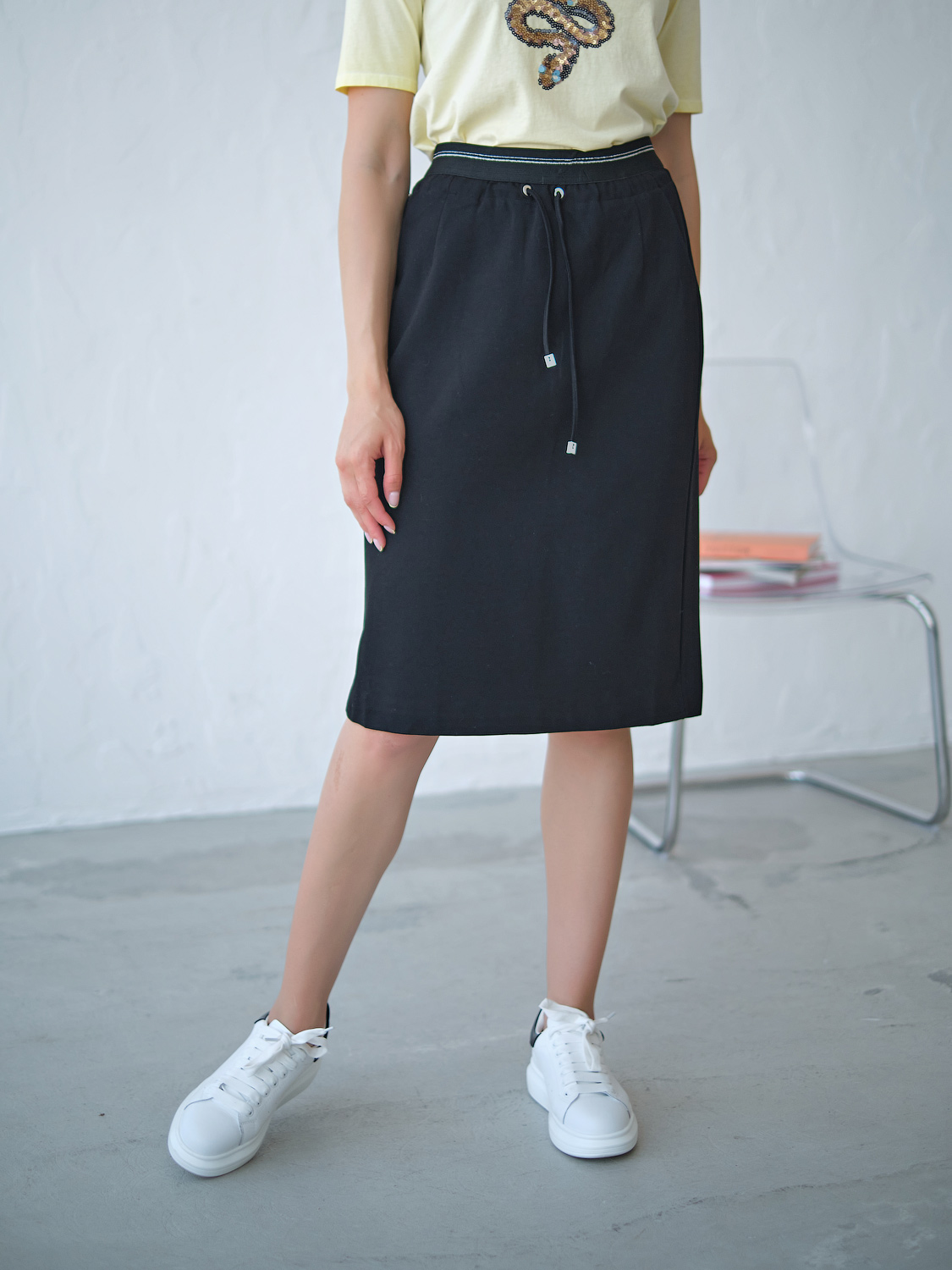 Юбка прямого кроя. Универсальная длина до колена. Прорезные карманы. Шнуровка на талии.