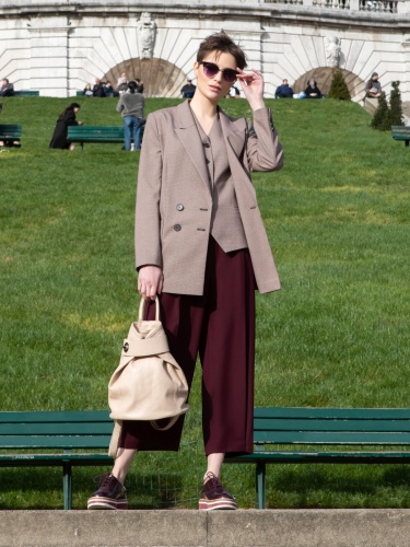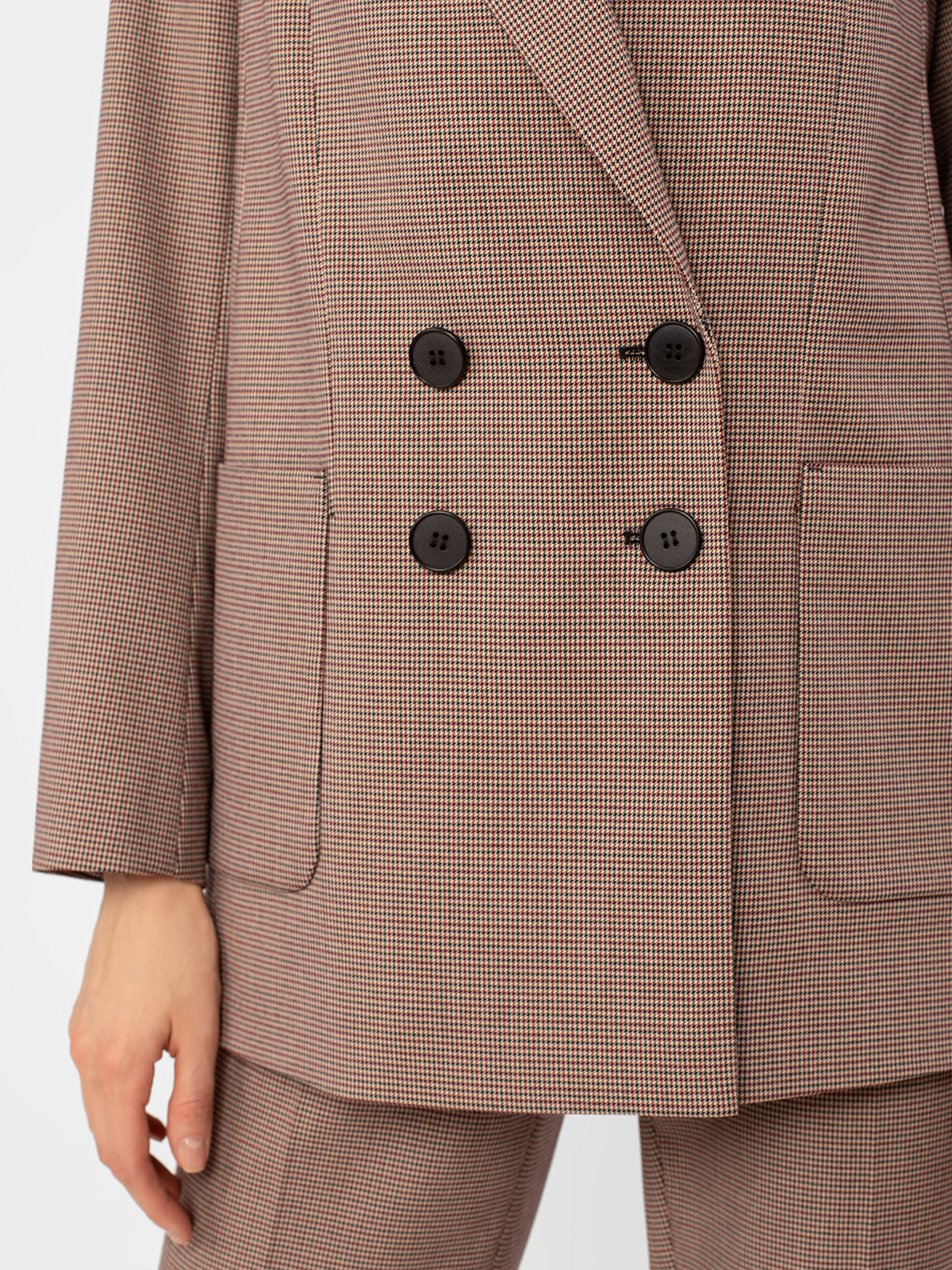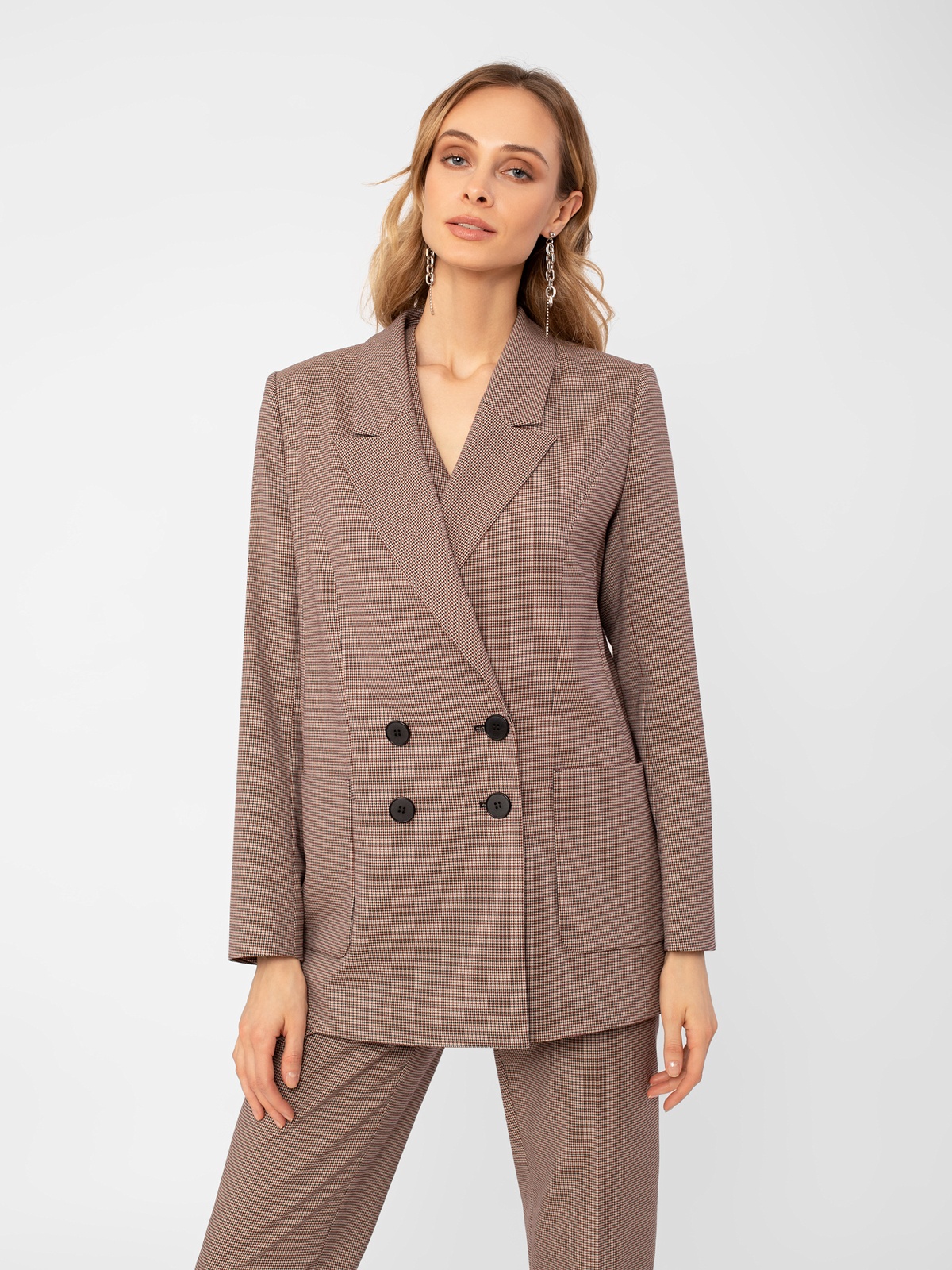 Жакет в стиле кэжуал, прямой свободный силуэт, на подкладке. Воротник английский. Рукав втачной. Застежка двубортная на пуговицы. Карманы накладные.