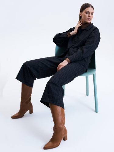 Жакет свободного кроя на пуговицах. Отложной воротник, накладные карманы с клапанами, втачной рукав полной длины.