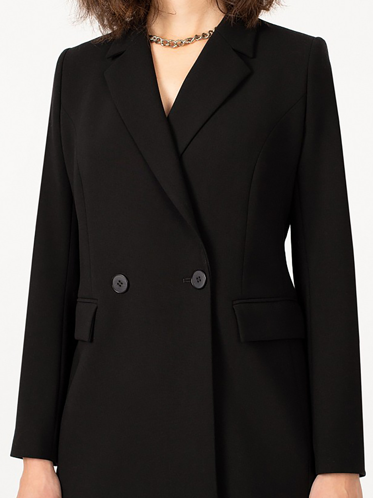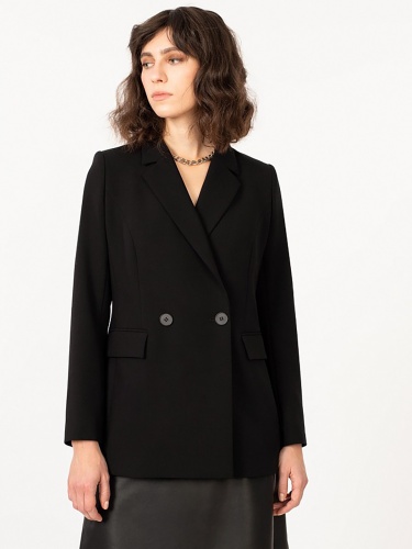 Строгий черный жакет на пуговицах – незаменимая классика для образов в офисном стиле. Отложной воротник с лацканами, втачной рукав полной длины.