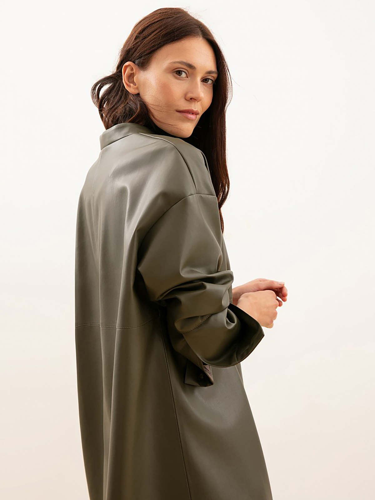 Жакет свободного силуэта из экокожи цвета хаки. Воротник-стойка, супатная застежка на пуговицы. Спущенная линия плеч, длинные рукава с манжетами.