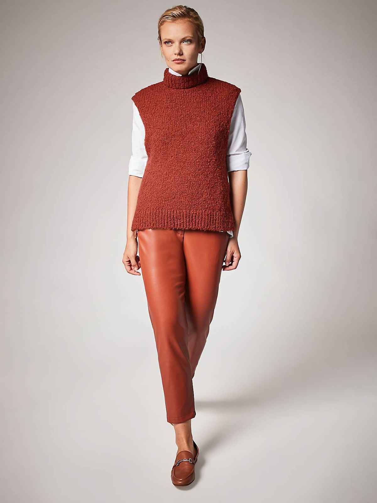 Однотонный вязаный жилет прямого кроя с добавлением шерсти альпаки в составе хорошо сохраняет тепло и приятен на ощупь. Предпочтительнее носить жилет поверх рубашки, джемпера или водолазки. Высокий воротник-стойка, по низу вязаная резинка в рубчик.