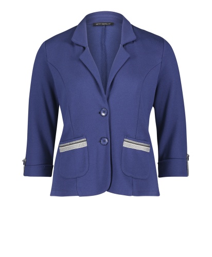 Классический жакет - абсолютно необходимый элемент женского гардероба! Слегка приталенный крой подчеркивает достоинства фигуры. Отложной воротник, застежка на пуговицах, рукава 3/4 с патой для подворачивания, карманы с отделкой. Блестящая тесьма придает образу нотку гламура. Материал из хлопковой смеси приятен к телу и обеспечивает комфорт. Этот жакет будет изюминкой как делового, так и кэжуал образа.