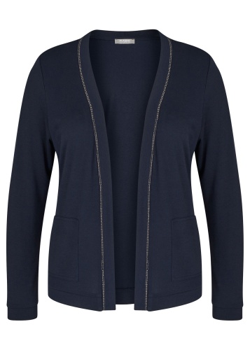 Темно-синий базовый блейзер. Накладные карманы, втачной рукав полной длины с манжетой. Украшение в виде страз по всей длине отворота.