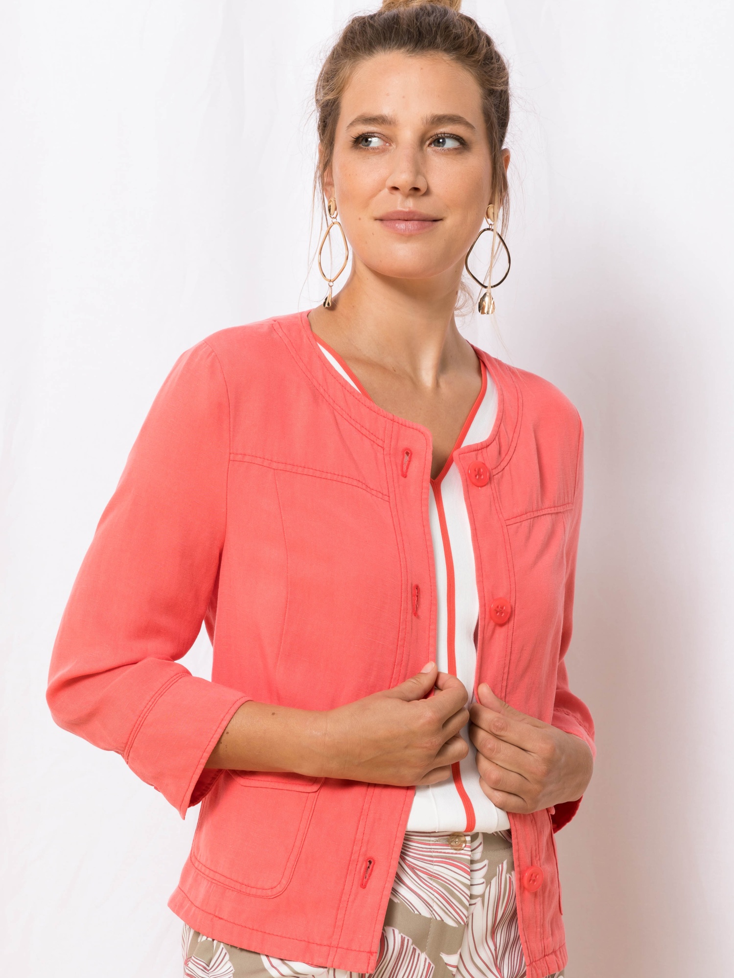 Однотонный жакет в яркой расцветке создаст летнее настроение! Ткань из смеси люцелла и льна идеально подойдет для жаркой летней погоды. Овальный вырез горловины без воротника, планка с пуговицами в тон изделия. Втачной рукав длиной 3\4.