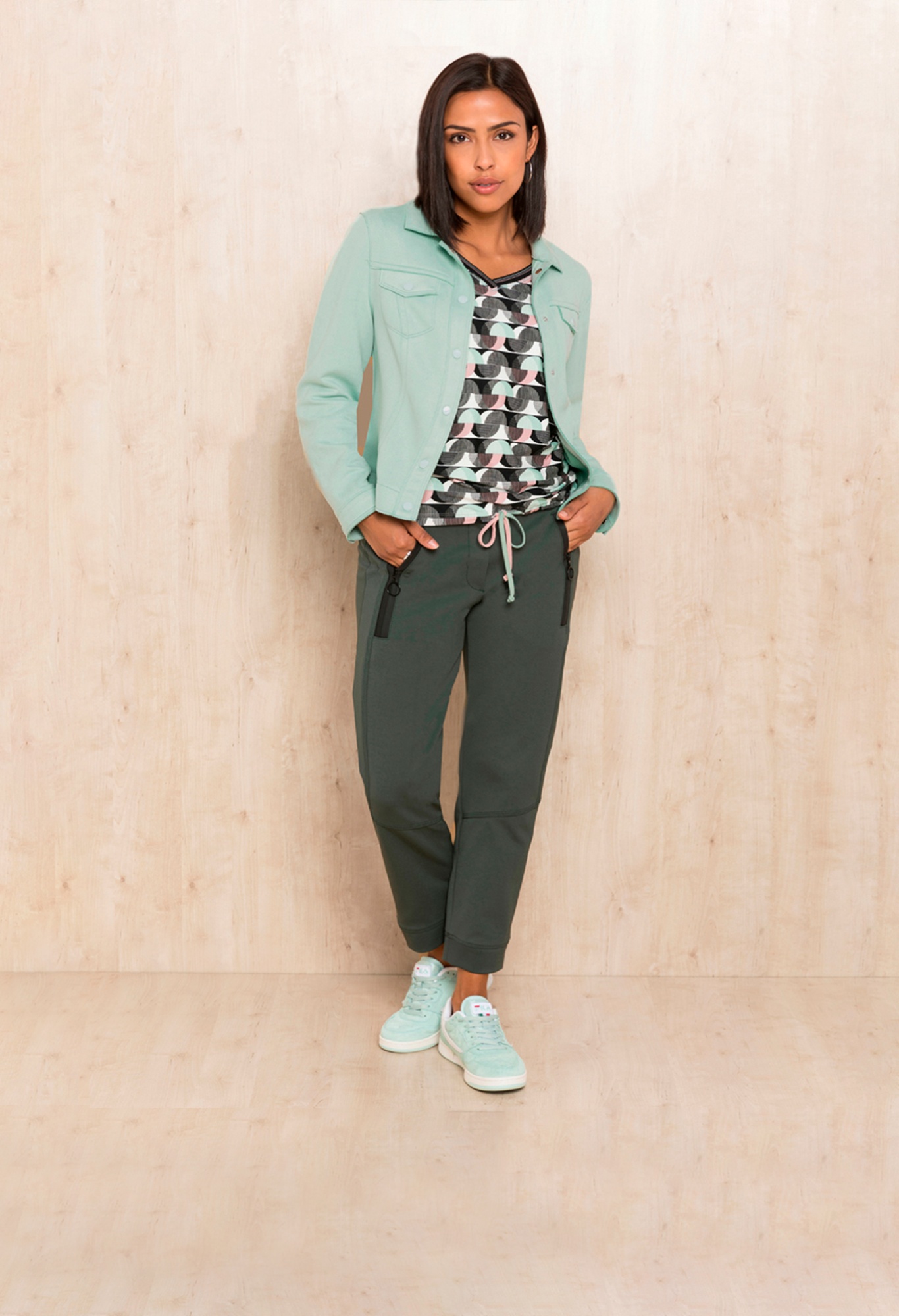 Приталенный жакет нежного мятного оттенка. Воротник с отворотами. Втачной рукав полной длины с манжетой на пуговице. Накладные карманы на груди. Застежка на клепки.