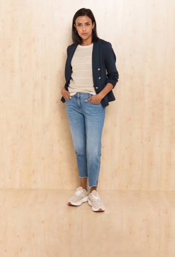 Однотонный жакет подойдет как для делового стиля, так и для повседневного городского образа. Пиджачный воротник с лацканами. Акцентные крупные пуговицы. Боковые прорезные карманы с листочкой. Втачной рукав полной длины.