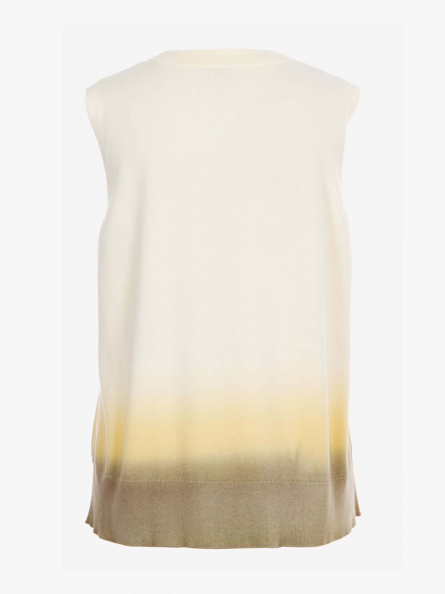 Свободный трикотажный топ без рукавов. Узкая круглая шея с рубчатыми манжетами.