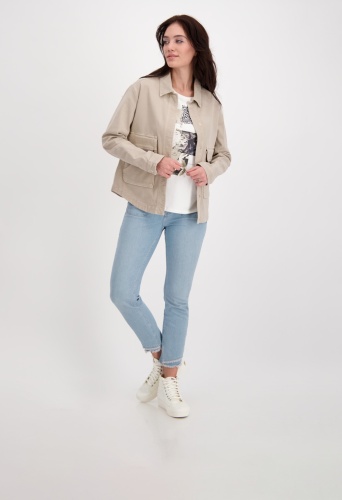 На сайте указаны Российские размеры. Куртка с отложным воротником и накладными карманами. Модель с длинными рукавами и потайной планкой на кнопках отличается большими карманами с клапанами на цепочке и дополнительными прорезными карманами спереди. Форма: прямой крой с закругленным низом, отложной воротник, рукава заканчиваются разрезом и манжетами на одной пуговице. Швы: передний плечевой, продольные разделительные швы на рукавах и спинке, кокеточный шов на спинке. Параметры модели: 42 размер, рост 176 см
