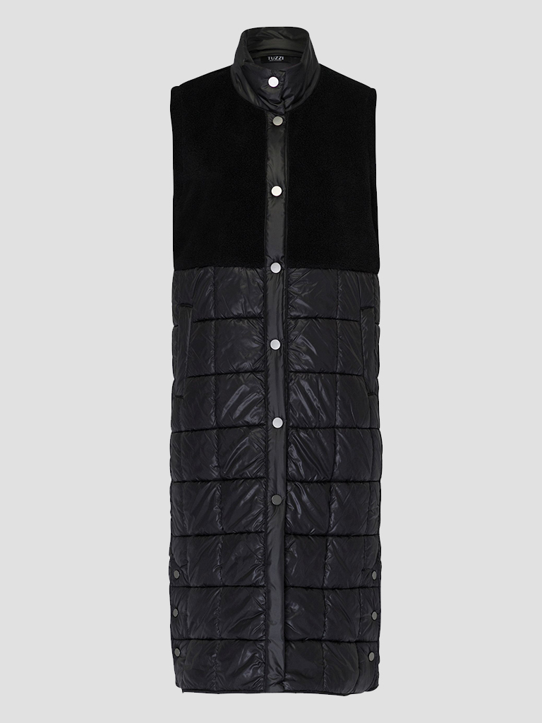 На сайте указаны российские размеры. Жилет с отделкой из искусственного меха в области плеч и груди, которые переходят в квадратный стеганый рисунок на уровне талии. Сквозная панель с кнопками легко открывается и закрывается. Высокий воротник, пуговицы по низу и боковые карманы делают образ идеальным.