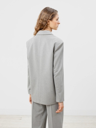 На сайте указаны Российские размеры Стильный жакет на подкладке удлиненного прямого силуэта из трикотажного полотна с v-образным вырезом, английским воротником и укороченным втачным рукавом. Низ бортов закруглённый. Спереди рабочие карманы в рамку и застежка на две пуговицы. Рост модели на фото - 175 см.