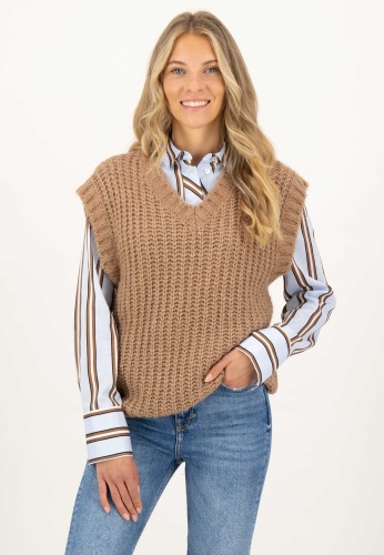 На сайте указаны российские размеры. Приятный мягкий свитер-жилет. С этой моделью из высококачественных материалов вы сможете создавать крутые образы в холодные дни. Благодаря V-образному вырезу слиповер идеально сочетается с блузой с отложным воротником или воротником-стойкой или со свитером с высоким воротником. Свободный крой в сочетании с ребристым вязанием и контрастным вязанием на рукавах, V-образном вырезе и по низу придают комбинезону спортивный и повседневный вид. Рост модели: 177 см. Измерения для 44 размера: Окружность груди: 57 см Бедра: 37 см Длина по спинке: 53 см Пройма: 25см