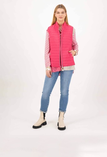 На сайте указаны российские размеры. Женственный спортивный стеганый жилет из легкого высококачественного материала. Жилет впечатляет своим лаконичным видом благодаря горизонтальной стежке, которая сочетается с продольной стежкой по бокам. Эта комбинация также делает их фигуру льстивой. Его можно комбинировать по-разному, и благодаря насыщенному розовому цвету он придает каждому образу что-то свое. Женственный спортивный образ подчеркивают два боковых кармана, которые можно застегнуть на кнопку. Еще одним привлекательным элементом жилета является тонкое блестящее сердце под воротником-стойкой на спине. Модель ростом 177 см Измерения для 44 размера: Окружность груди: 103 см Талия: 96 см Бедра: 115см Длина по спинке: 68 см