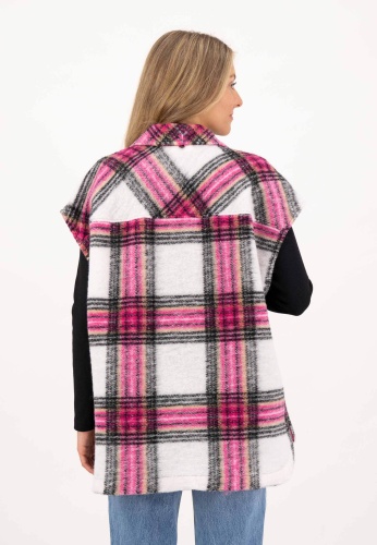 На сайте указаны российские размеры. Шерстяной жилет с ярким рисунком в клетку и стильными деталями. Этот уютный жилет не только согревает, но и привлекает внимание. Стильный узор в клетку в сочетании с прямым кроем и свободным кроем создают современный образ. Большие нагрудные карманы, планка на пуговицах и отложной воротник подчеркивают повседневный характер жилета. Изделие буквально завершает закругленный низ. Модель ростом 177 см Измерения для 44 размера: Окружность груди: 125 см Талия: 125 см Бедра: 125 см Длина по спинке: 75 см