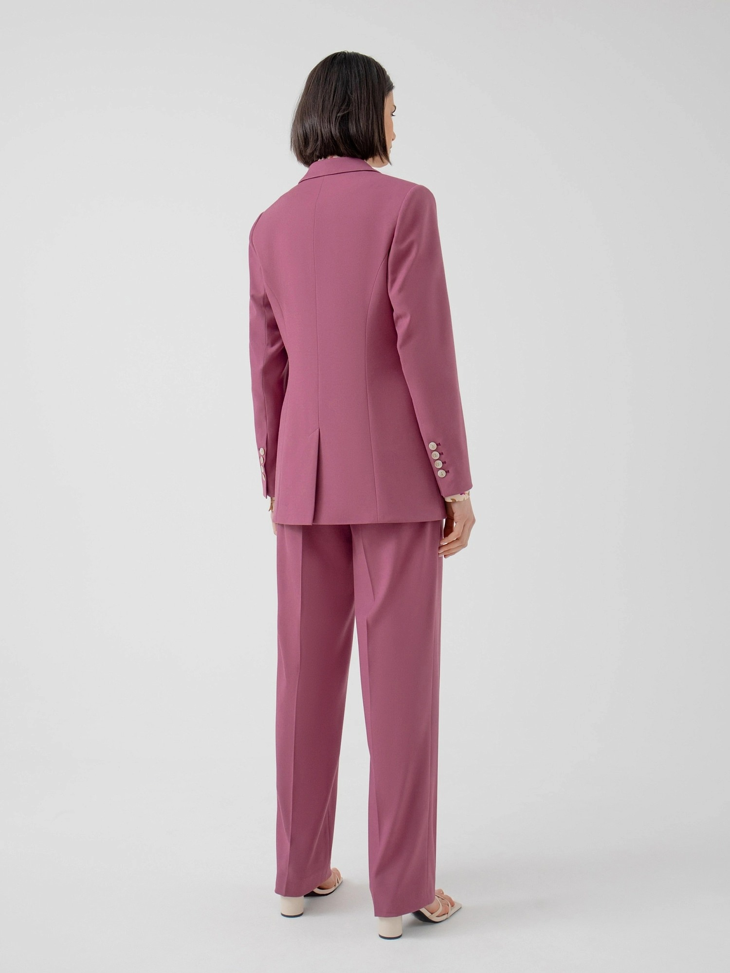 На сайте указаны российские размеры. Прямой удлинённый однобортный жакет с ложной застежкой на пуговицы. Английский воротник с остроконечными лацканами. На полочке два наклонённых кармана с клапанами. Жакет полностью на подкладке и выполнен из костюмной ткани в благородном цвете "амарант". Составит дерзкий ансамбль с широкими брюками из этой же ткани. Рост модели 175 см.