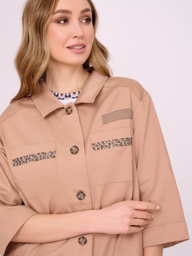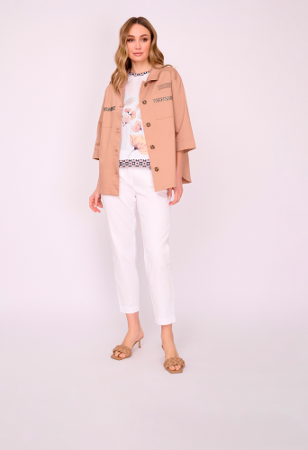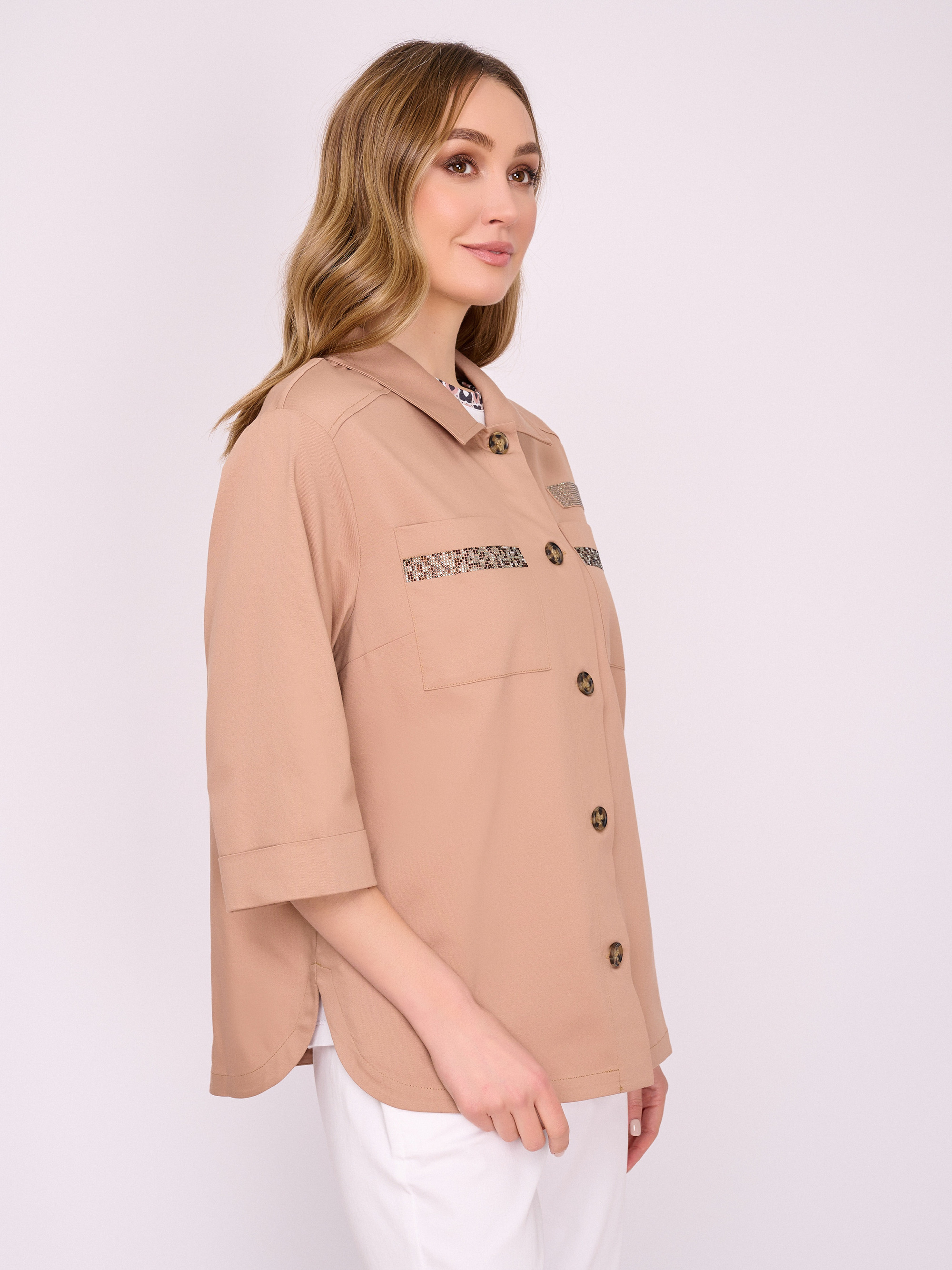 На сайте указаны российские размеры. Бежевый жакет трапеция на пуговицах, с отложным воротником, с накладными карманами, с рукавом 7/8, со стразами, с боковыми разрезами. Длина по спинке: 67 см. Рост модели: 175 см.