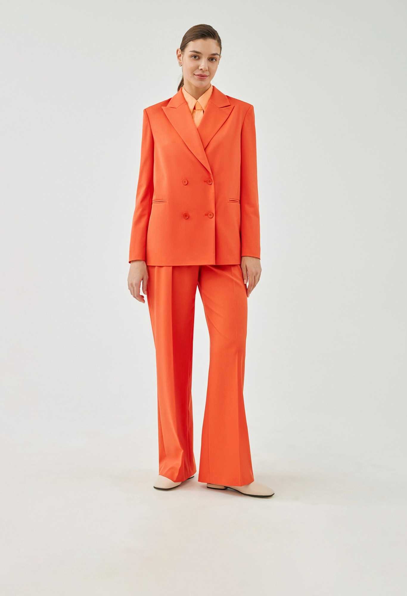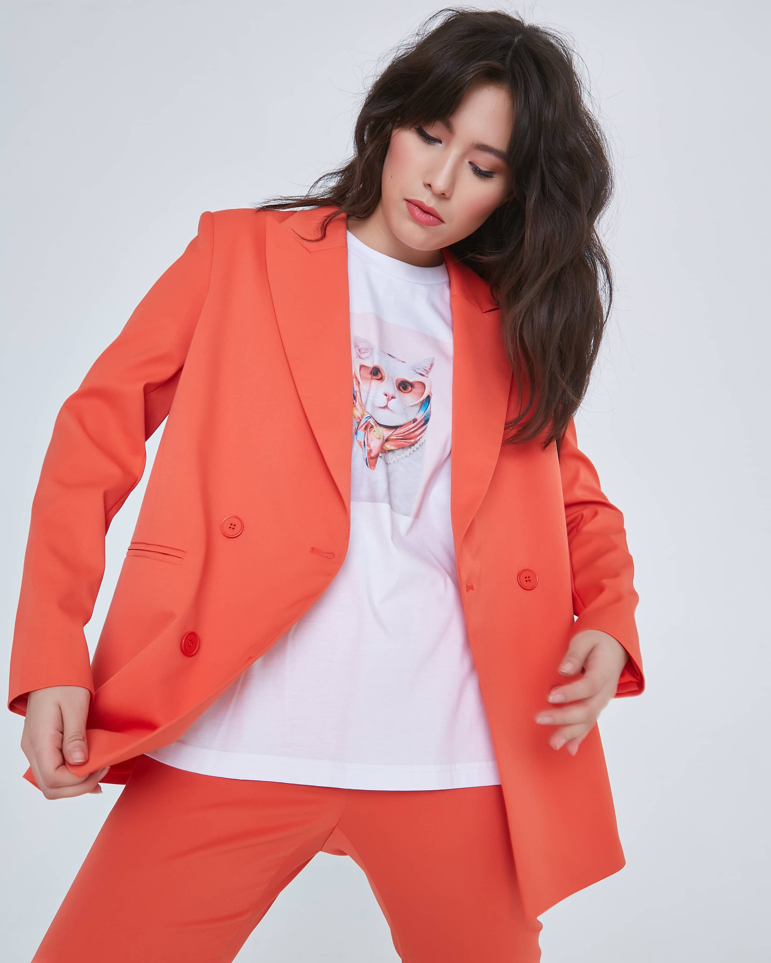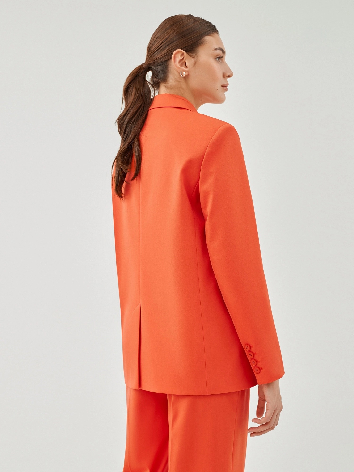 На сайте указаны российские размеры. Свободный удлинённый двубортный жакет из костюмной ткани в ярком цвете "грейпфрут". С прорезными карманами листочками и пуговицами в цвет ткани. Жакет полностью на подкладке. Такой жакет составит яркий ансамбль с брюками из одной ткани, а так же будет ярким акцентом в повседневном образе с джинсами. Рост модели 175 см.