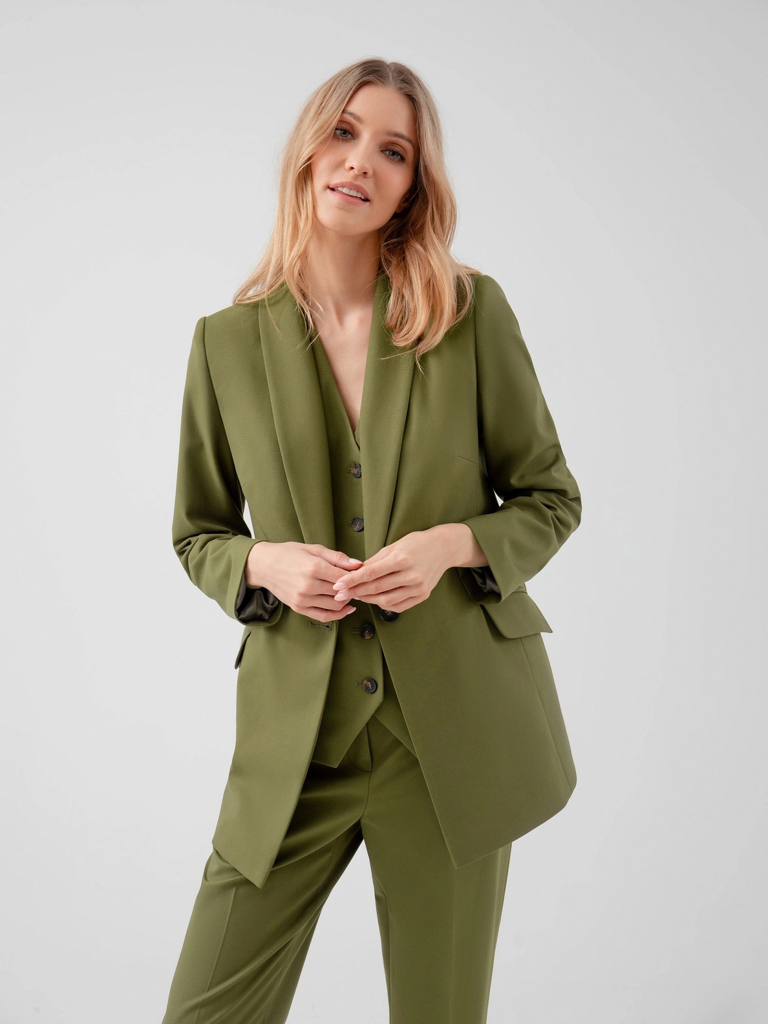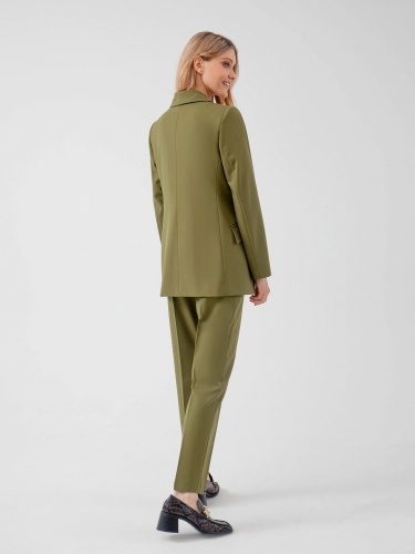 На сайте указаны российские размеры. Прямой удлинённый однобортный жакет с V-образным вырезом, воротником-шаль. С наклонными карманами и клапанами. Жакет полностью на подкладке. Рост модели 175 см.