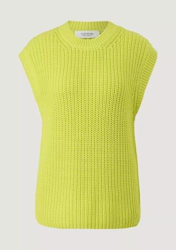 На сайте указаны российские размеры. Вязаный жилет из трикотажа, круглый вырез горловины с окантовкой в рубчик. Подол с разрезом по бокам. Длина спины 65 см в размере 42 Рост модели 178 см.
