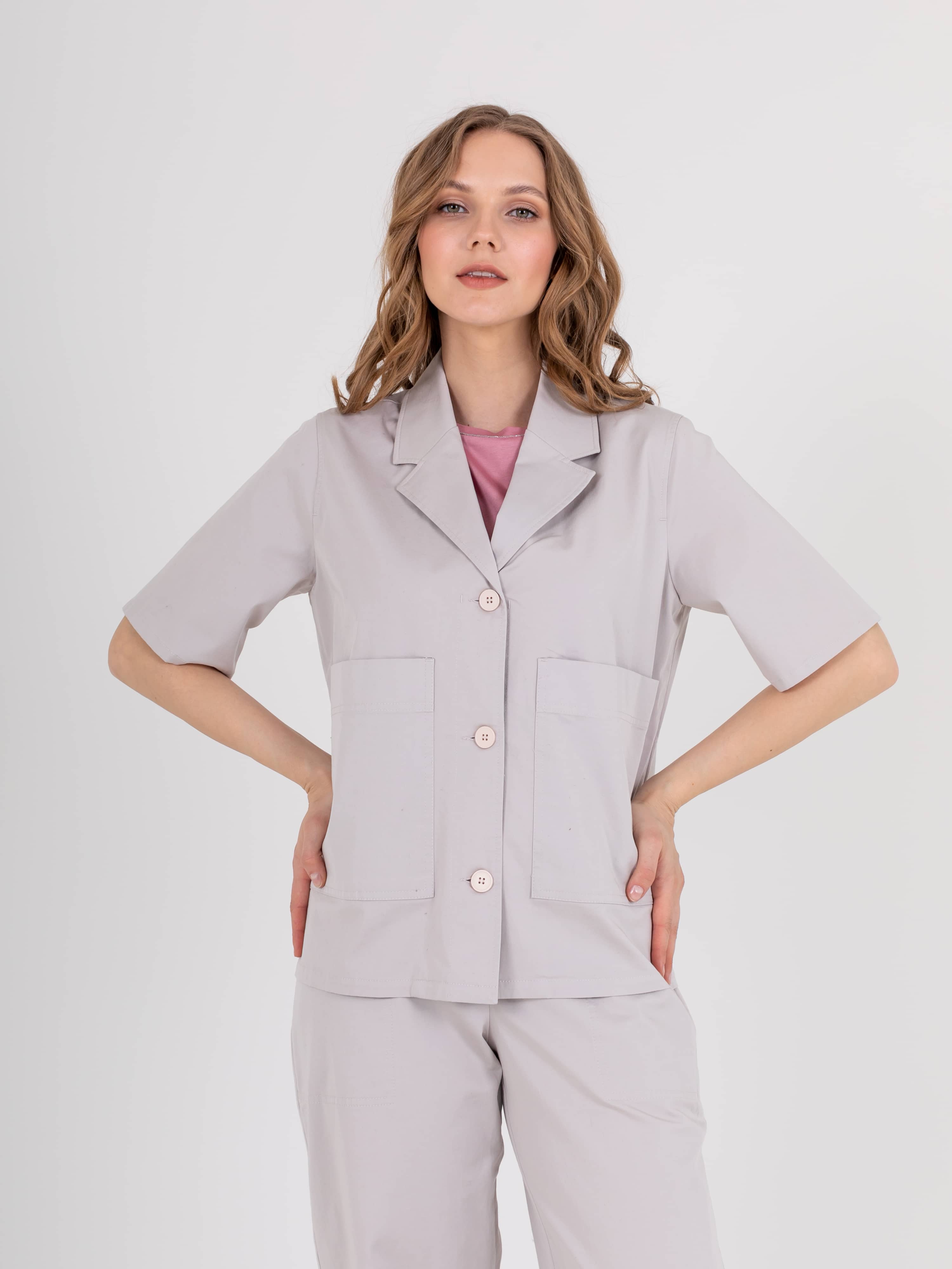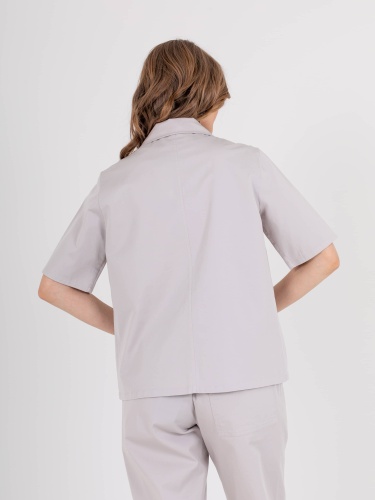 Укороченный жакет прямого силуэта из легкого хлопка с добавлением эластана. По переду два накладных кармана. Застежка на три прорезных петли и пуговицы. Укороченные втачные рукава. Пиджачный воротник.