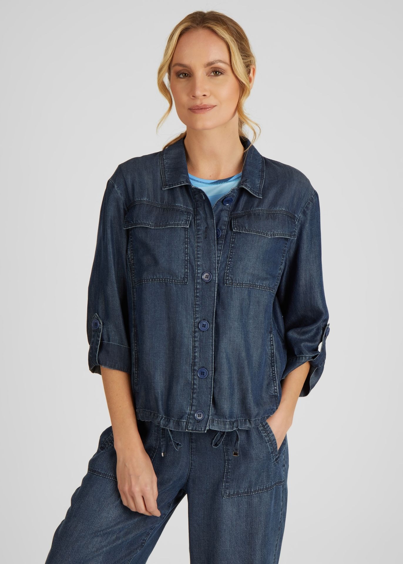 Модная куртка на пуговицах с рукавами 3/4 в джинсовом стиле и рубашечным воротником - абсолютный must-have для каждой женщины, следящей за трендами! Широкая форма обеспечивает удобную посадку, а кулиска на кромке позволяет регулировать куртку индивидуально. Куртка имеет практичные боковые карманы и стильные нагрудные карманы.