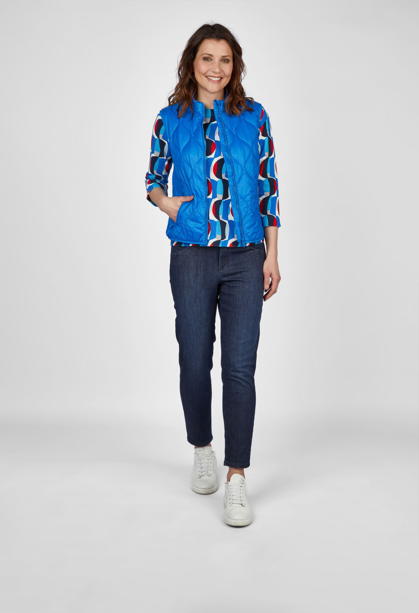Жилет впечатляет простым однотонным дизайном и современным воротником-стойкой, который защитит от ветра и холода. Практичная молния позволяет легко надевать и снимать сумку, а карманы на молнии сохранят ваши ценные вещи в безопасности. Легкий и дышащий материал обеспечивает оптимальный комфорт в любой ситуации. Этот стеганый жилет можно носить как дополнительный слой под курткой или отдельно поверх блузки. Длина спинки от плеча для 44 размера: 64см.