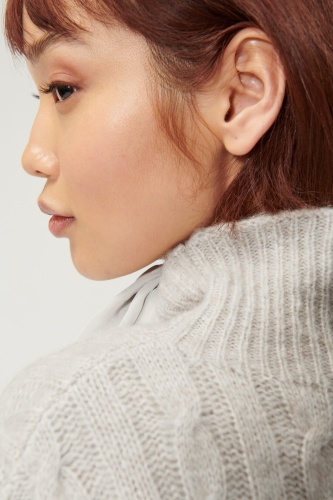 Легкий пуловер косой вязкой из высококачественной итальянской смесовой шерсти с эффектом меланжа. Объемный пуловер-кейп с ребристым воротником-водолазкой.