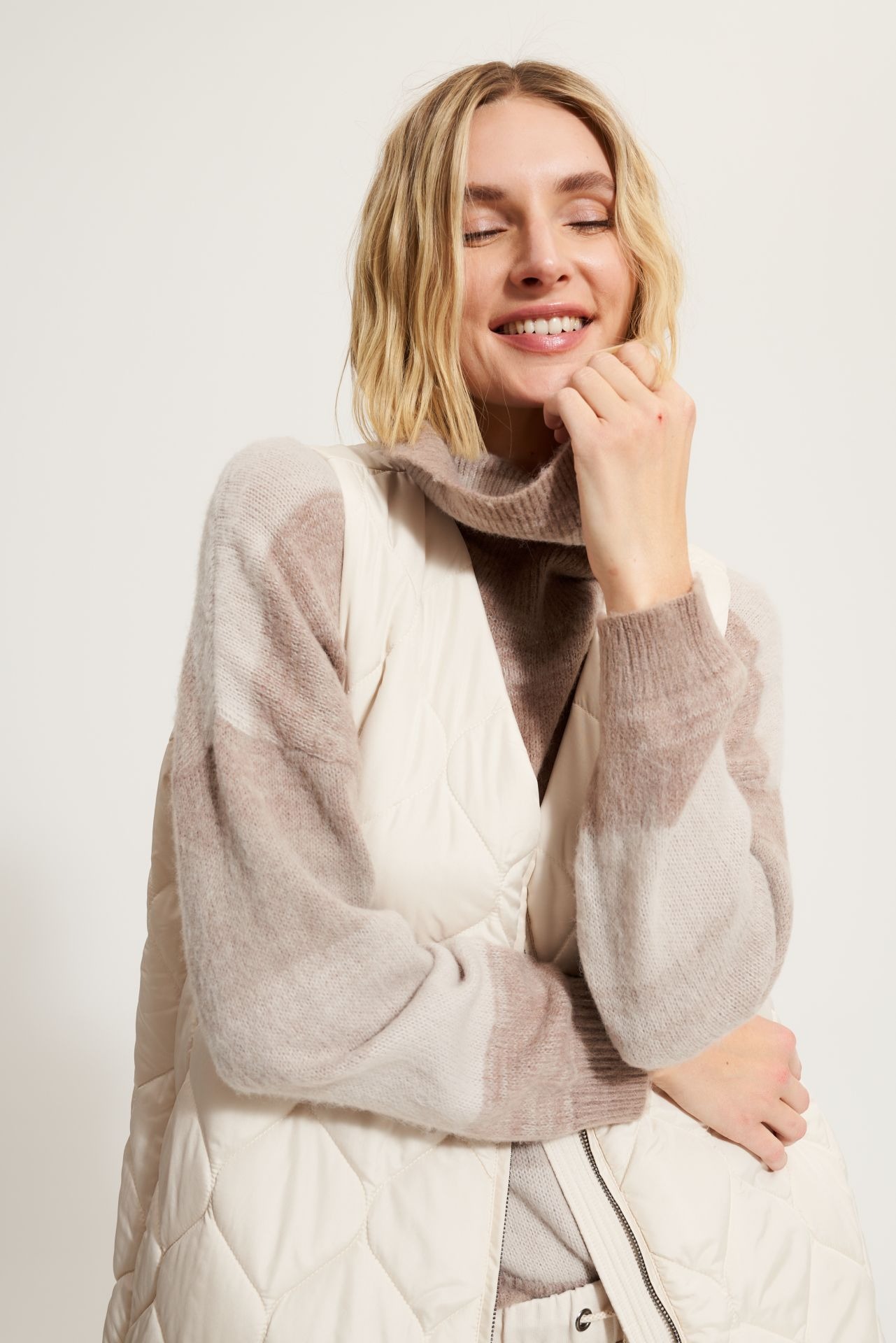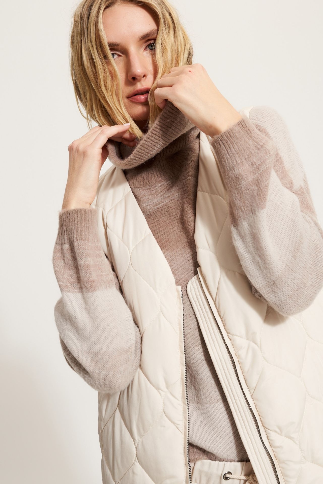 Длинный стеганый жилет из полиэсфира. V-образный вырез. Молния с логотипом со стеганой подкладкой. Карманы в боковых швах. Длина: 115 см.