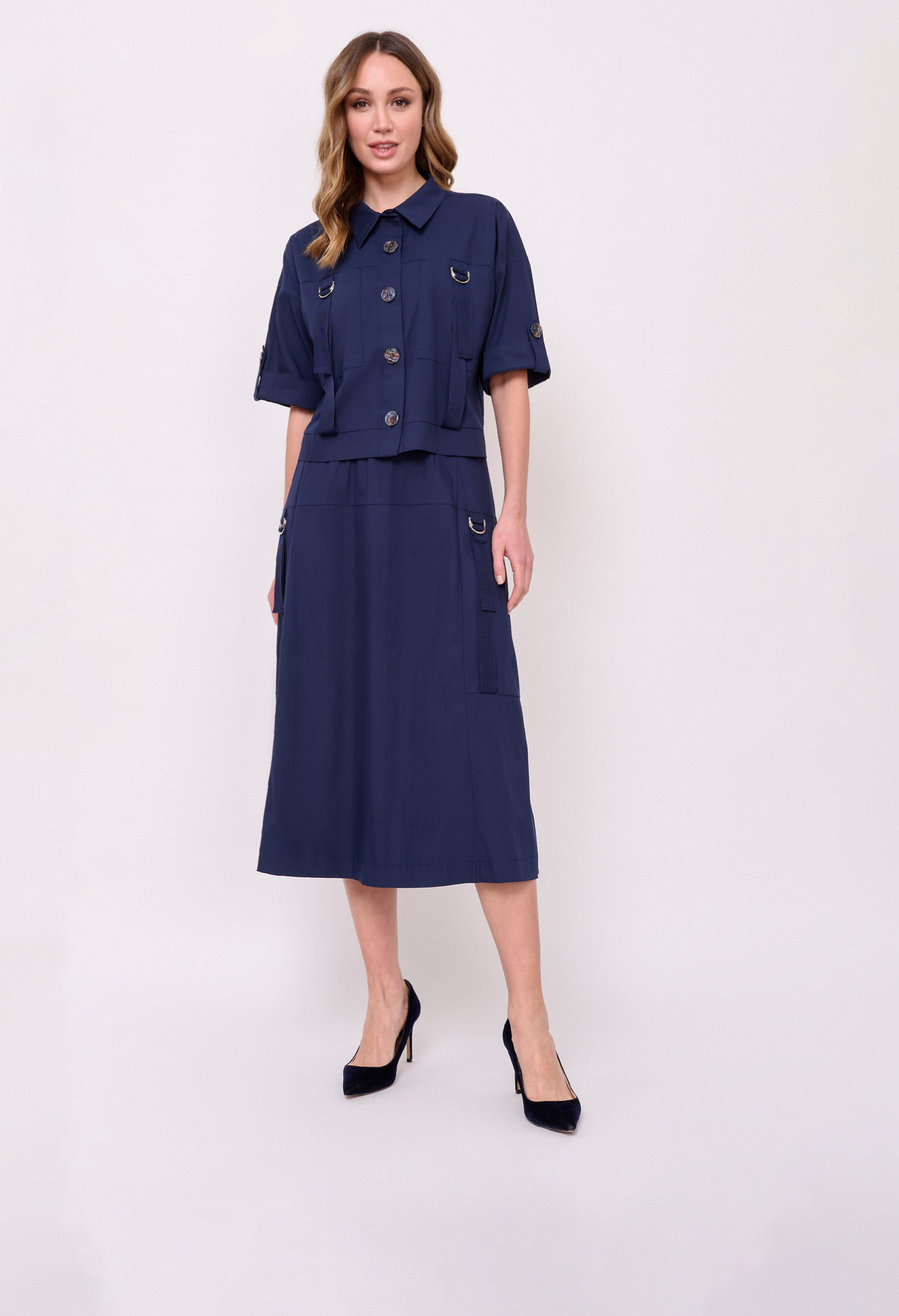 Укороченная блуза-жакет, застежка пуговицы, вырез горловины отложной воротничок, рукава короткие, карманы накладные, хлястики с металлическими пряжками. Длина по спинке: 51 см.