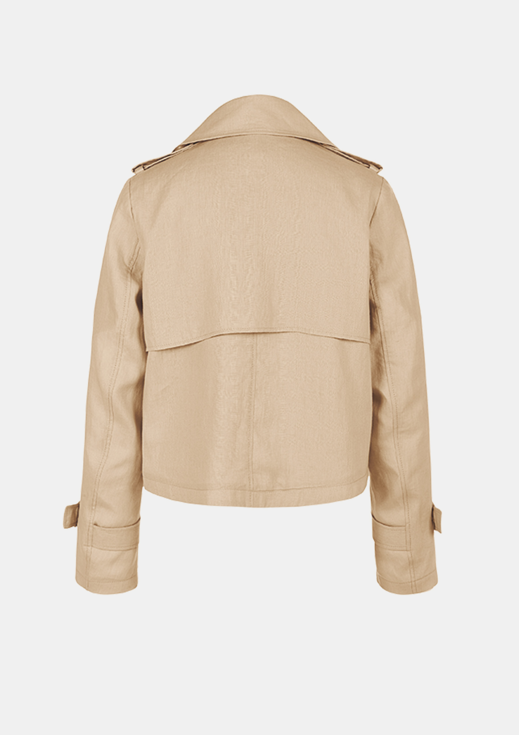 Современный льняной жакет в модном стиле тренча. Этот двубортный пиджак повседневного кроя с типичными элементами тренча станет идеальным спутником на свежем воздухе.