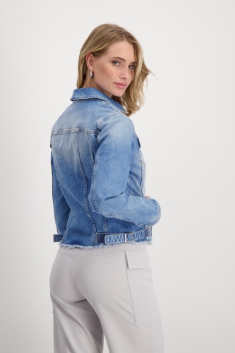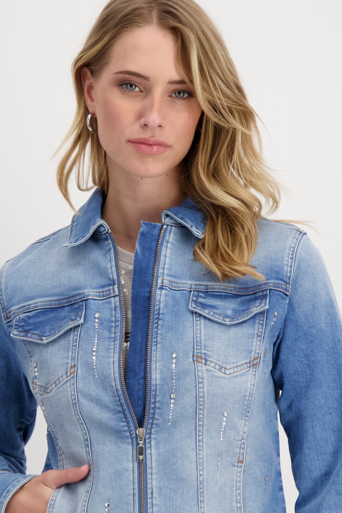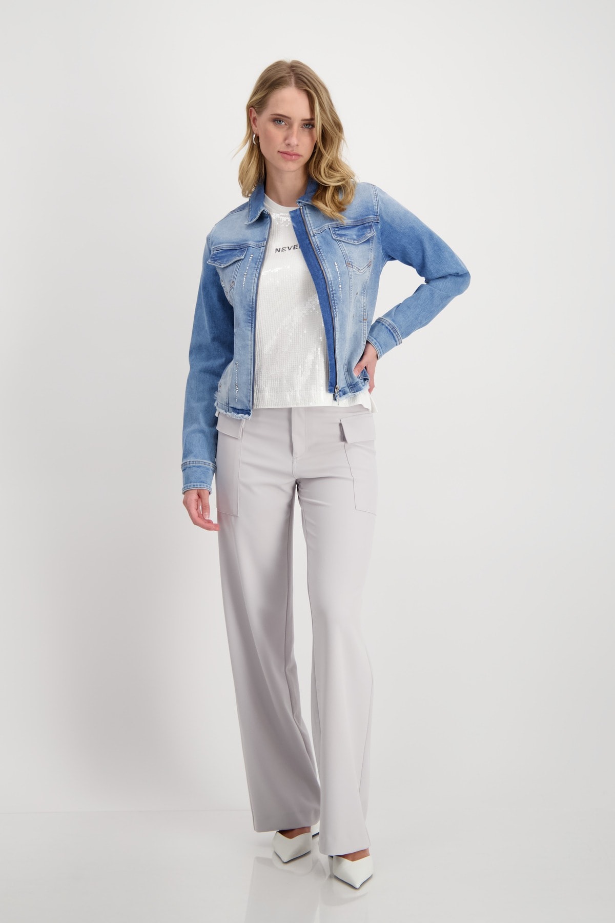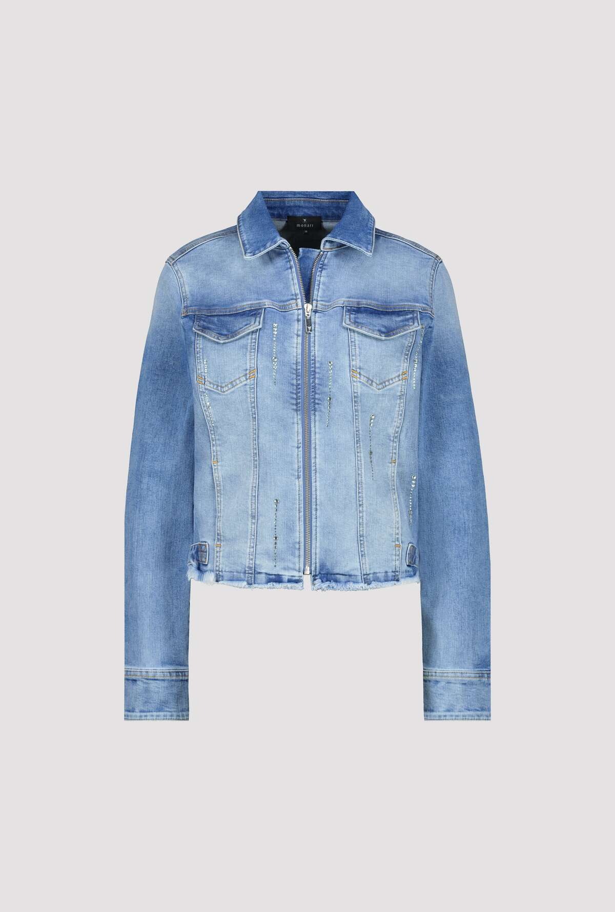 Стильная джинсовая куртка с мерцающими полосками из стразов. Закругленный подол с бахромой подчеркнут закрепкой. Регулярная посадка. Длинный рукав. Подол рукава с разрезом и манжетами. Накладные карманы с клапанами на уровне груди. Длина 44 размера 55 см.