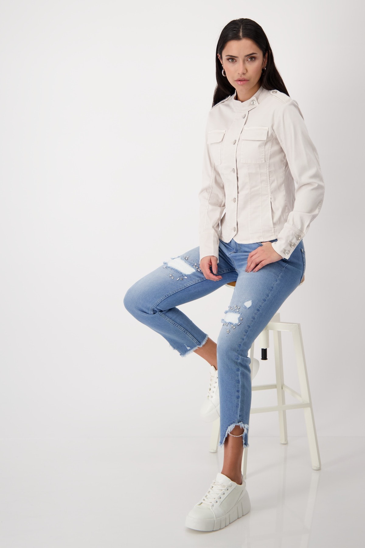 Стильная куртка из мягкого смесового лиоцелла с карманами с клапанами и бретелями, украшенная декоративной пуговицей. Эластичный материал. Регулярная посадка. Воротник-стойка и бретели с декоративными пуговицами. Длинные рукава с манжетами. Накладные карманы с клапанами на уровне груди. Удлиненная, закругленная передняя часть. Длина 44-го размера по спинке — 57 см, длина по переду — 59 см.