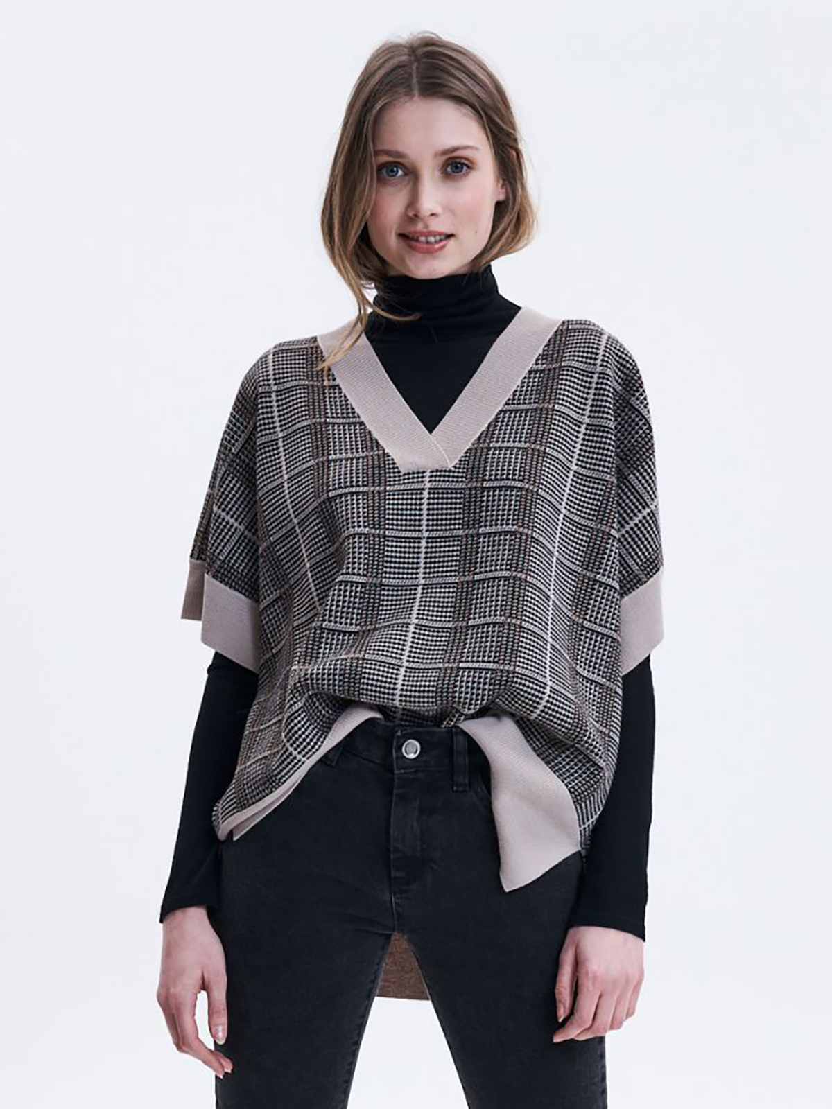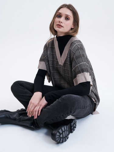 Оверсайз жилет в клетку с V- образным вырезом. Широкие контрастные манжеты в рубчик, спущенная линия плеч. Разрезы в боковых швах. Материал из смесовой шерсти приятен на ошупь и хорошо сохраняет тепло.