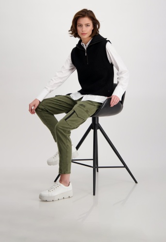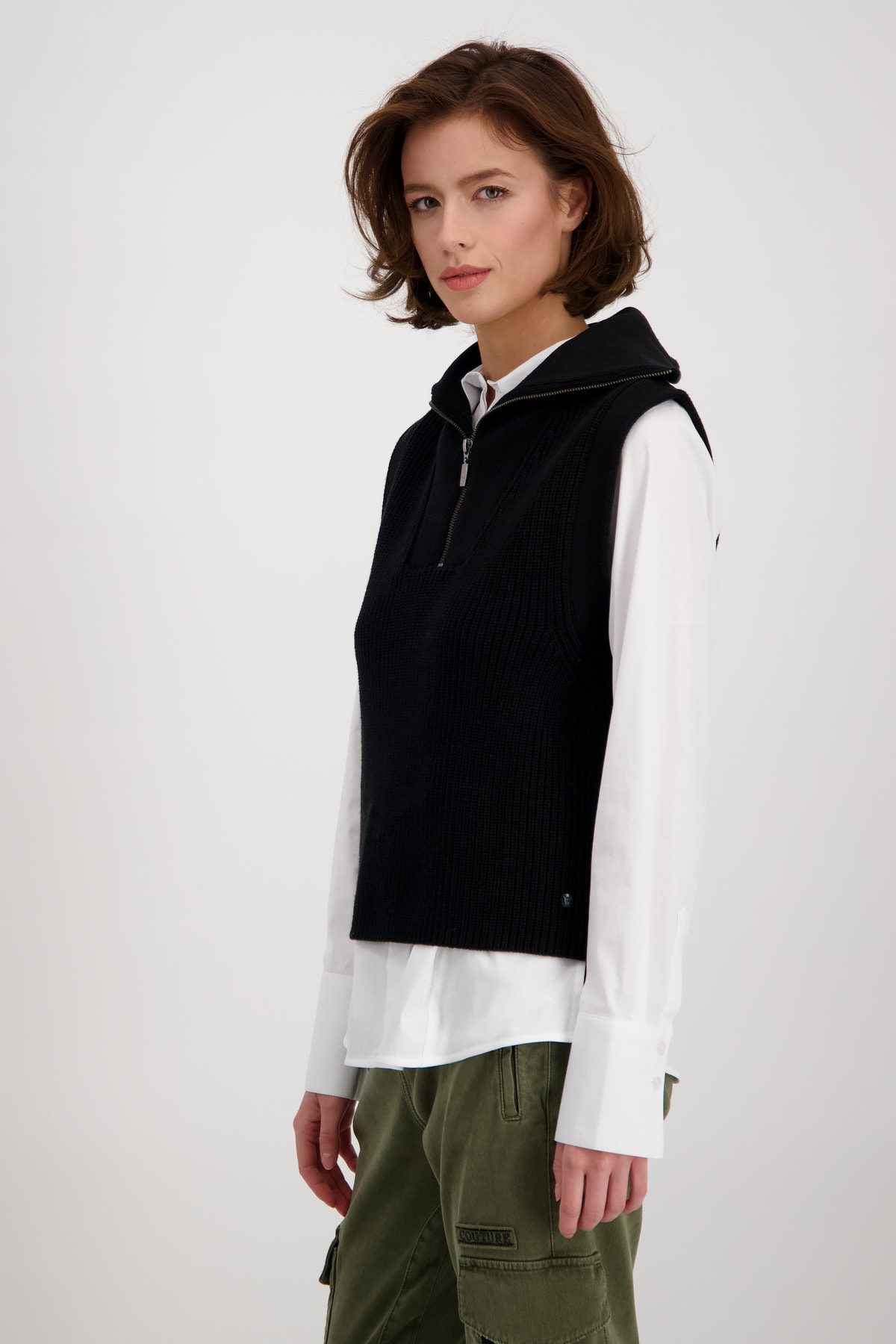 На сайте указаны российские размеры. Трикотажный жилет с тройным воротником и молнией. Модель прямого кроя с застежкой-молнией на воротнике Troyer и вязаной манжетой на ложных концах рукавов. Модель без рукавов представляет собой женственную структуру Perlfang и обещает удобную посадку благодаря производству высококачественного хлопка, смешанного с полиакрилом. Модель ростом 178 см.