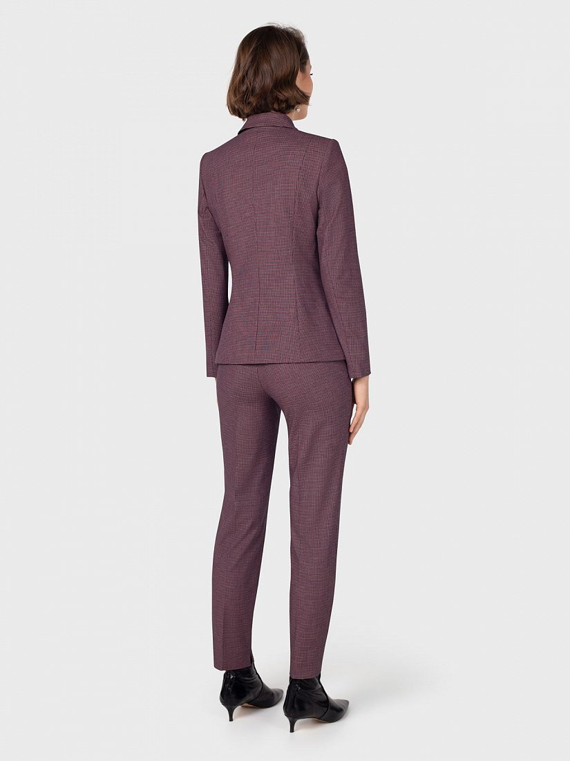 Классический жакет полуприлегающего силуэта на подкладке с втачным рукавом полной длины, классическим отложным воротником и прямоугольными накладными карманами. По верху карманов контрастная декоративная отделка. Застежка спереди на пуговицы.