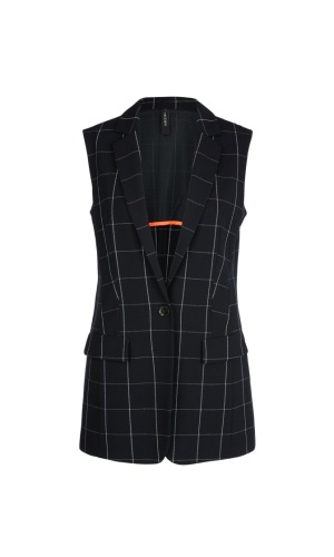 Удлиненный жилет в клетку. Приталенный силуэт, английский воротник, застежка на пуговице, декоративные клапаны на переде изделия.