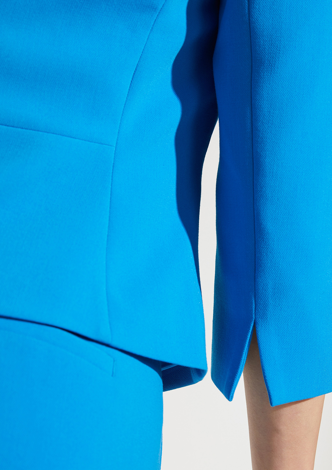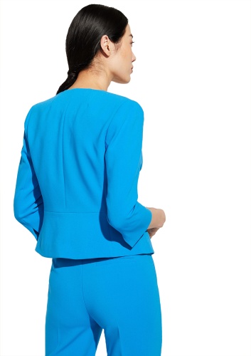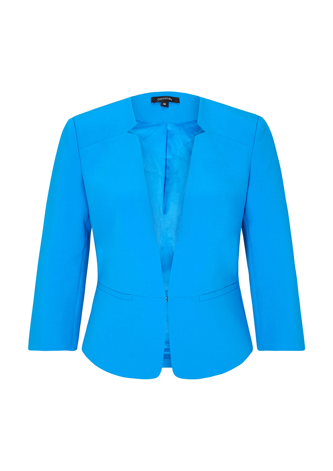 Однотонный яркий жакет с фигурным вырезом. Втачной рукав длины 3/4 с разрезами. Материал из смесовой вискозы приятен к телу и обеспечивает комфорт ношения.