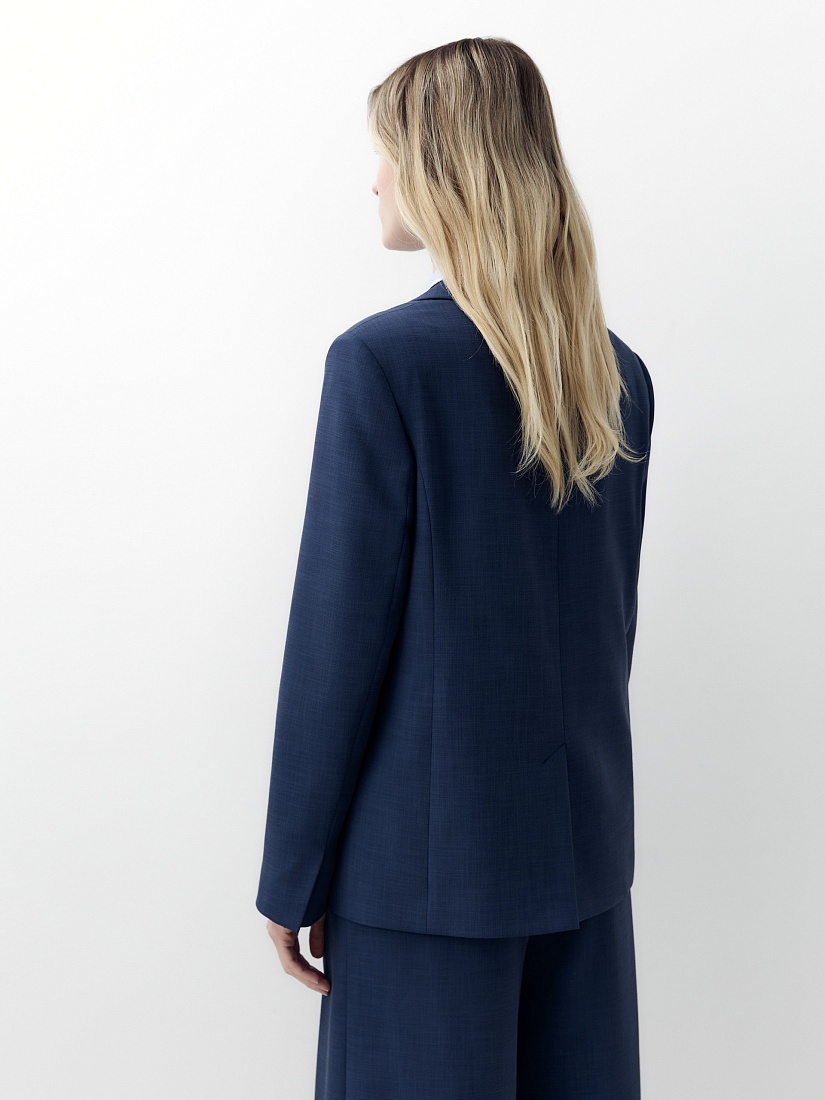 Удлиненный прямой однобортный жакет с V-образным вырезом и английским воротником. Жакет на двух пуговицах с прорезными карманами и клапанами, на спинке шлица.