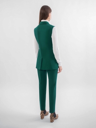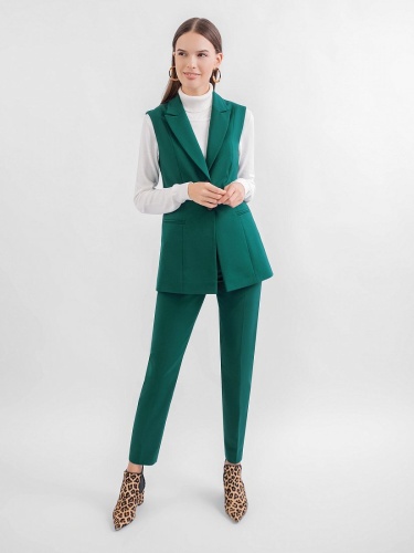 Жилет из костюмной ткани на подкладке полуприлегающего силуэта с v-образным вырезом, английским воротником и застежкой спереди на пуговицу. Спереди рельефы и карманы листочки. Сзади шлица.